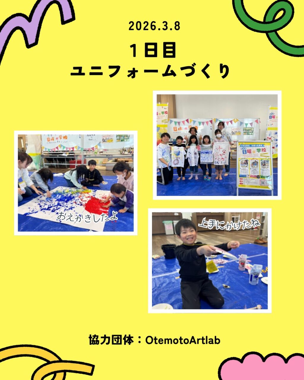 - 【第1回】創造力を解き放つアート体験 身近な素材を使ったユニフォームとのぼり作りを実施。正解のないアート体験の中で、偶然生まれる不思議な模様や色の重なりを楽しみました。