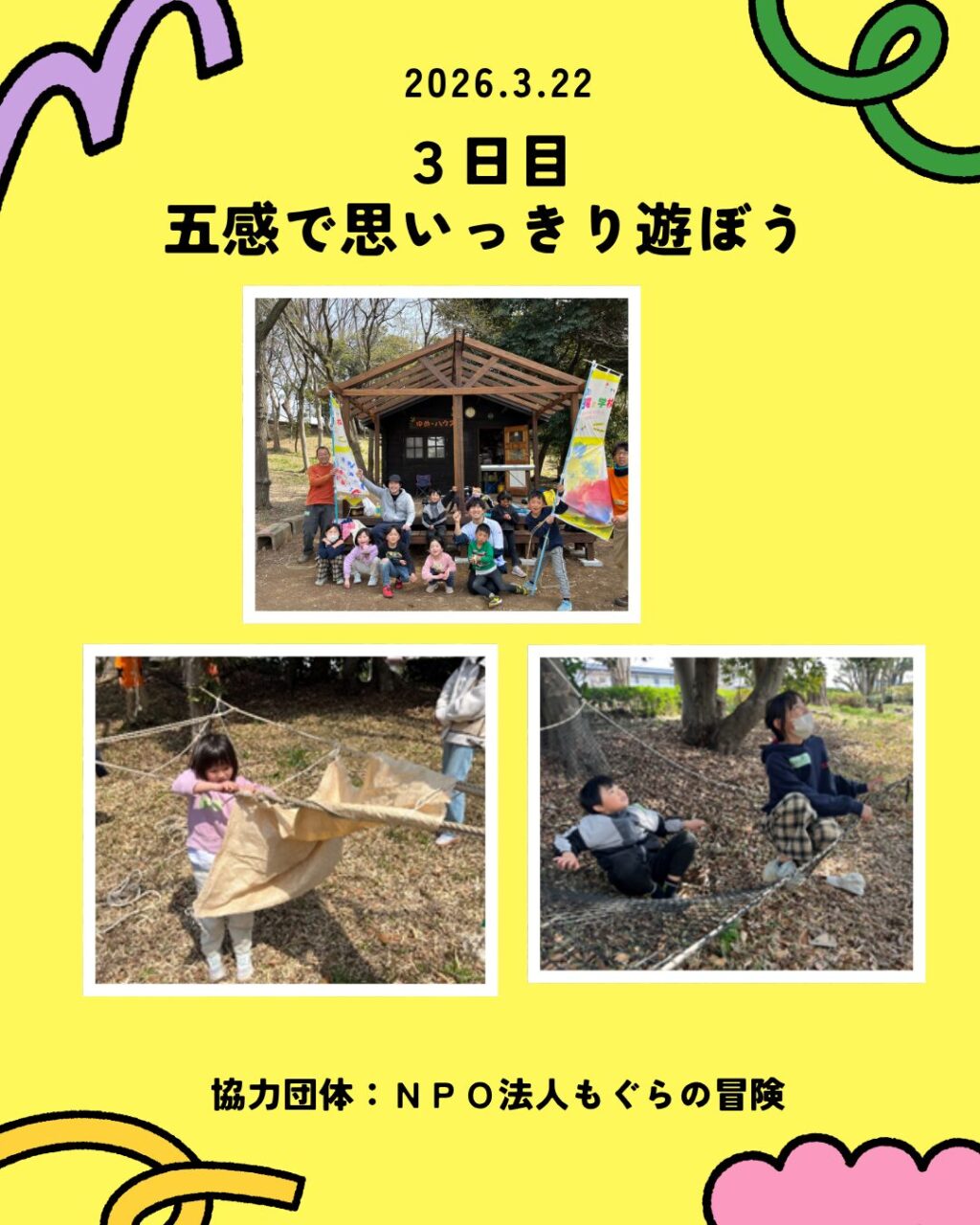 - 【第3回】五感を研ぎ澄ますロープワーク 身近な木とロープを使い、知恵を絞ってトランポリンや滑り台を作るダイナミックな遊びを展開。五感を最大限に発揮し、自然の中で身体を動かす喜びを共有しました。