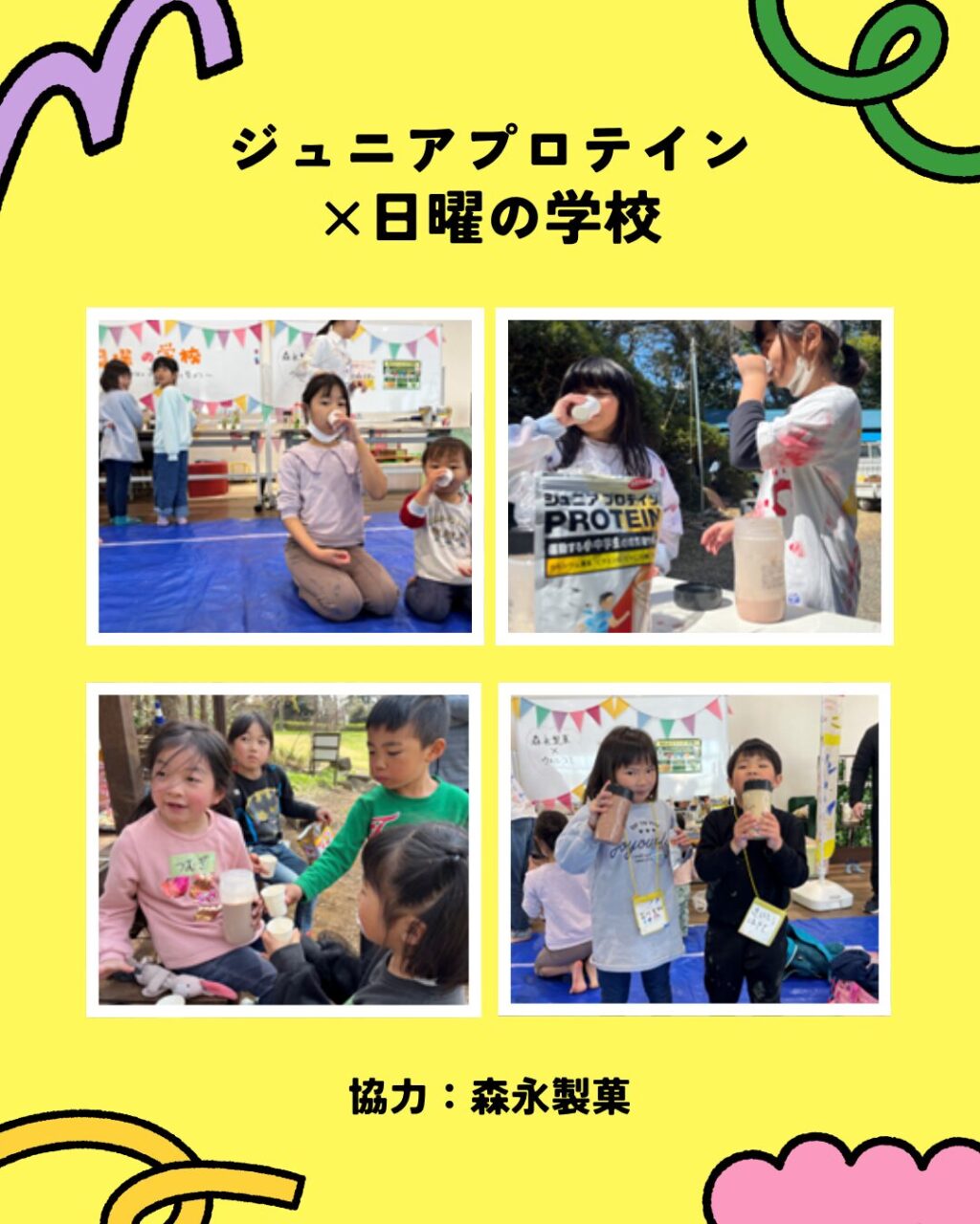 今回のプログラムでは、運動後のエネルギー消費に対する栄養補給として、森永製菓株式会社様より提供いただいた「ジュニアプロテイン」を導入しました。 単に栄養を摂るだけでなく、「自ら作ってシェアする」という体験をセットにすることで、遊びを通じた達成感と、成長のための身体作りをセットで学べる貴重な機会となりました。